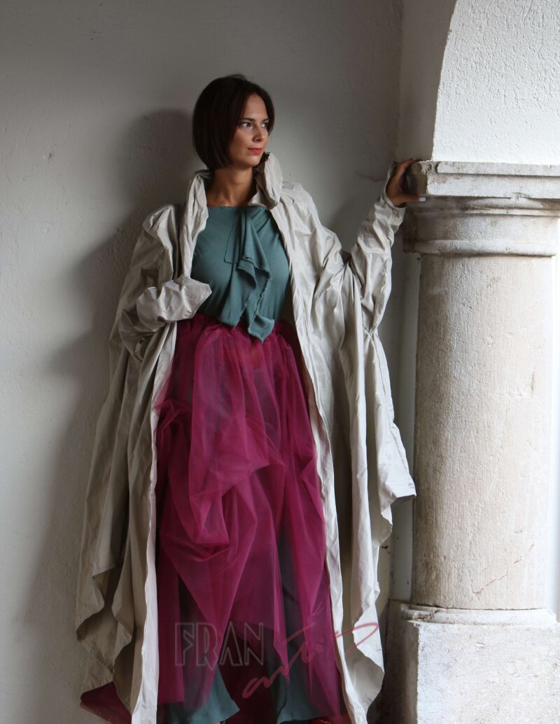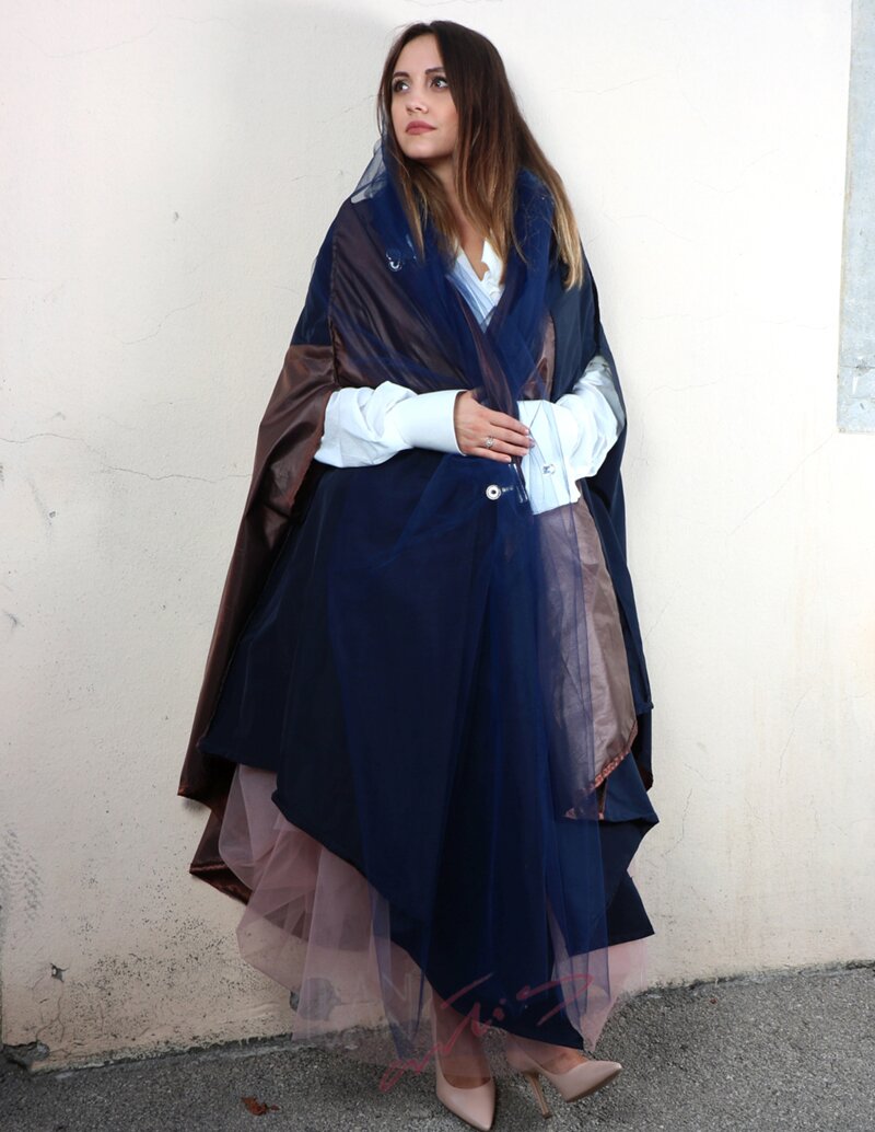THE INSPIRATION is in the rustling movement of polyester taffeta of concrete colors and unpredictable modelling through the space of the day or night sounded by the rustling of rain